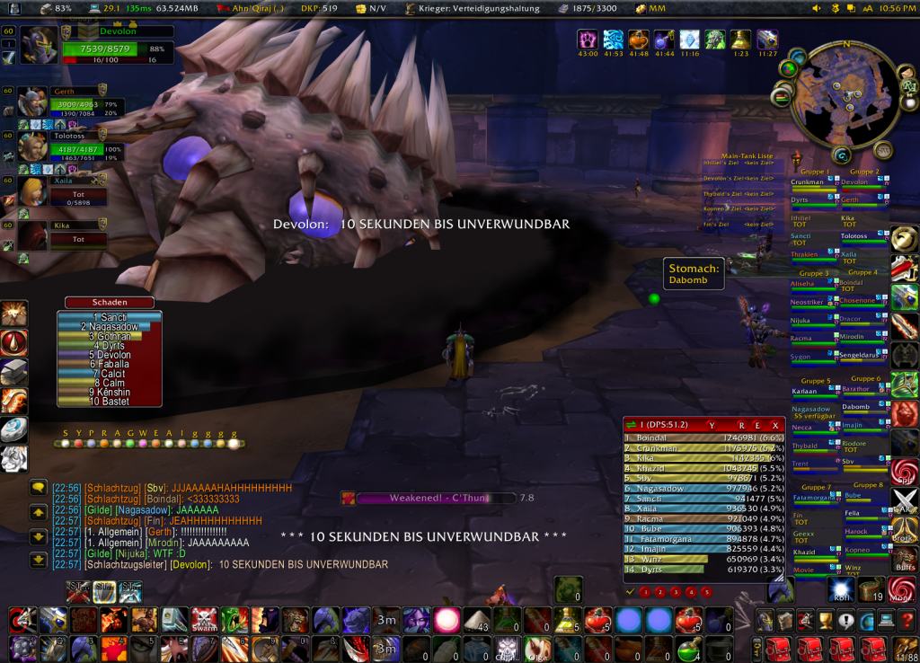 Lange hat es gedauert, aber heute Abend wurde es gegen 23 Uhr wieder laut im TS2. Der Grund hierfür, ganz einfach C'thun Statusanzeige in diversen Interface Mods wechselte von 1 auf 0% > Tot. Endlich können wir C'thun den Endboss von AQ auch auf unserer "Abschussliste" führen, obwohl Blizzard auch heute Abend wieder alles daran setze, uns um den Kill zu bringen. Bei jeder Phase 1 zwischen 4 und 8 Disconnects, Lags ohne Ende und die üblichen Bugs machen C'thun gleich nochmal so schwer. Trotzdem liessen wir und heute Abend nicht stoppen und brachten C'thun nach einer ersten perfekten Phase in 3 DMG Phasen Down. 50% > 7% > tot.