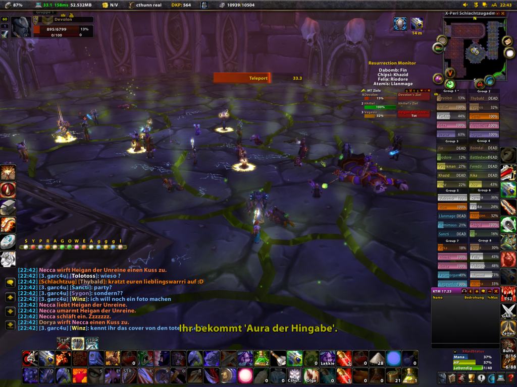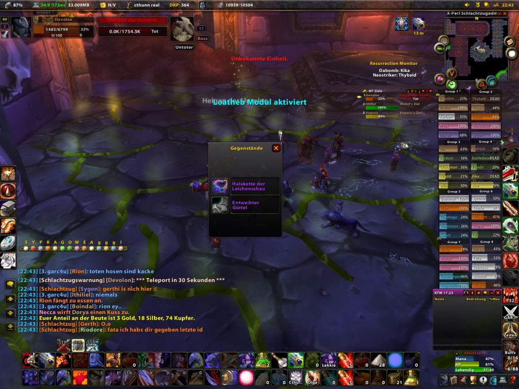 Heigan stand an, Boss Nr. 10 für uns, trotz diverser Member, die ich jetzt bewundere, dass sie überhaupt gehen können ( ) die ordentlich abgeschmatzt haben (immer und immer wieder ) hat am Ende doch die Gruppenpreformance gesiegt. Kurz und gut, wir haben Heigan, trotz seiner Lavasäure Tanzeinlagen aus den Sandalen geklatscht!!
