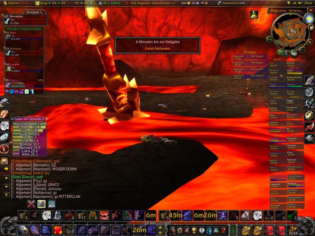 Nachdem wir in rasantem Tempo zu Domus vorstiessen, den wir ohne Probleme im 1. Try legten (mit ca 34 Mann^^), kamen wir zu Ragnaros. Der erste Try verlief schon super, aber aufgrund eines Zeit Stopp Fehler, überlebte Ragna diesen Try.